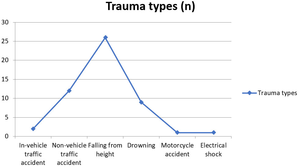 Falls from height were the most common cause of trauma (n=26, 47.3%), followed by traffic accidents and other mechanisms (Figure 1). The highest rate of admissions occurred in June (23.6%). Twenty-eight patients (50.9%) sustained traumatic brain injury, and 30 (54.5%) had multiple injuries involving other organs or systems. Twenty-one patients (38.2%) underwent surgery, most commonly neurosurgical (n=18, 85.7%) or pediatric surgical procedures (n=6, 28.6%). The majority of patients (n=53, 96.4%) had no significant comorbidities.