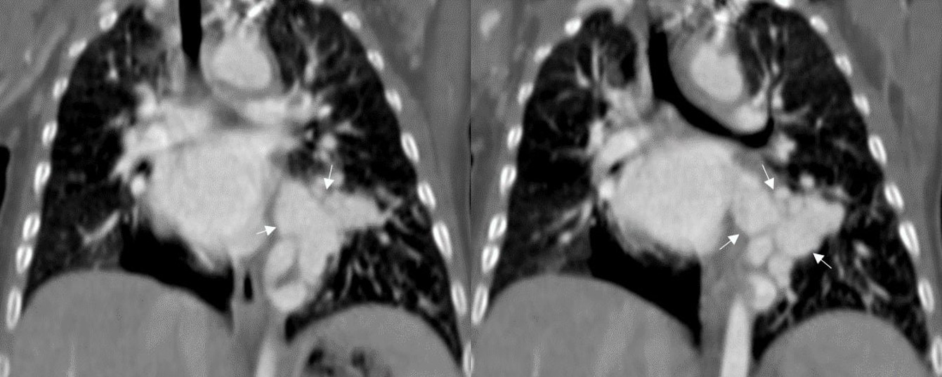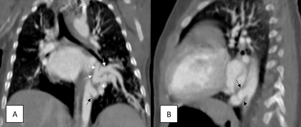CT imaging is the preferred noninvasive modality for diagnosing pseudosequestration, providing essential information on the origin of the aberrant artery, its vascular supply, and native pulmonary artery anatomy.9 Additionally, CT enables the exclusion of other vascular malformations and confirms normal bronchial branching. Dual blood supply, originating from both the systemic and pulmonary arteries, has been reported in certain patients.8 CT angiography with 3D volumetric imaging and multiplanar reformations is invaluable for treatment planning and determining dual pathology.