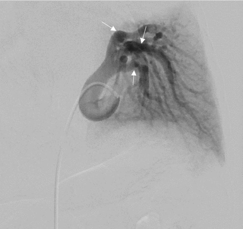 The development of this malformation is explained by the arrest of pulmonary artery growth during the development of the bronchial tree, resulting in an absence of pulmonary blood supply. Pseudosequestration may be congenital or may arise as a consequence of acquired conditions such as bronchiectasis, pulmonary tuberculosis, pulmonary infections, pulmonary thromboembolism, or chronic obstructive pulmonary disease. In affected patients, symptoms may also be attributable to the underlying disease.8 Primary patients may present with symptoms such as murmur, hemoptysis, exertional dyspnea, pulmonary hypertension, and congestive cardiac failure.1 Given the severity of these complications, early diagnosis and timely intervention are of critical importance. In this case, the only clinical finding was an incidentally detected cardiac murmur.
