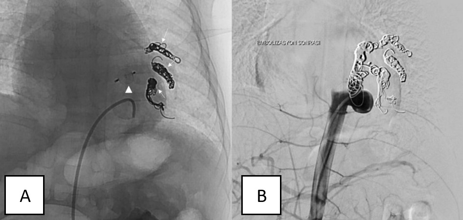 As discussed by Yamanaka et al.,7 surgical resection, including lobectomy or segmentectomy, was often the primary approach in treating complicated cases. Endovascular treatments, such as coil embolization of the aberrant artery, present viable and less invasive alternatives. Singh et al.1 successfully treated an aberrant arterial structure originating from the thoracic aorta in the left lower lobe using coil embolization.