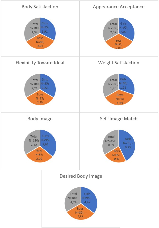 Results: Females experienced significantly more body dissatisfaction than their male counterparts (p < 0.05). Girls perceived themselves as overweight and aspired to a slimmer physique, resulting in a substantial discrepancy between their perceived and ideal body images. Males exhibited a comparatively higher level of physical satisfaction. A significant negative correlation exists between age and body satisfaction (r = -0.40, p < 0.01); dissatisfaction is more prevalent among females as they age.