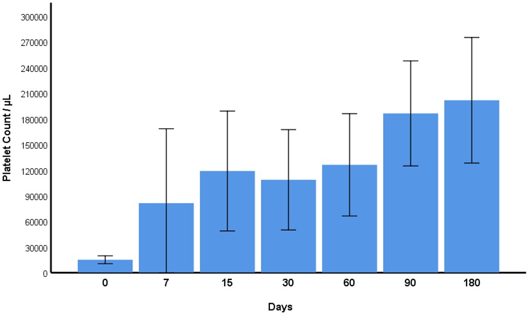 Sixty-seven percent (67%), 68%, and 76% of patients responded to treatment (platelet count >30,000/µL) at the 7th, 15th, and 30th days, respectively, after treatment.