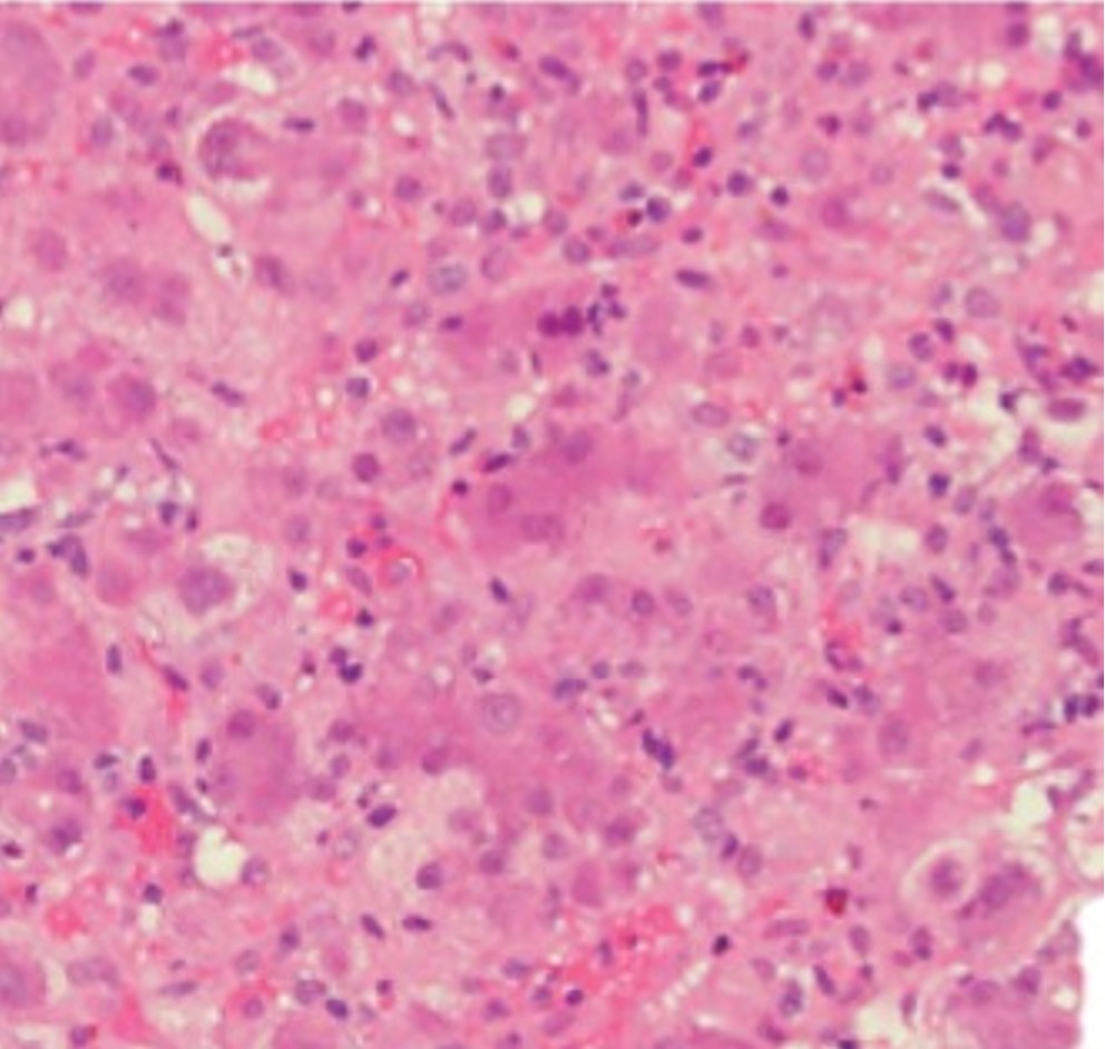 Liver biopsy demonstrated multinucleated giant hepatocytes, dense lymphoplasmacytic infiltrates, periportal/interface hepatitis, and focal eosinophils and neutrophils, consistent with GCH (Figure 1). Methylprednisolone (2 mg/kg/day) and intravenous immunoglobulin (IVIG, 1 g/kg) were started, with partial improvement by day 5. On day 10, due to clinical and biochemical deterioration, anti-CD20 monoclonal antibody (rituximab, 375 mg/m² weekly) was initiated. Azathioprine (2 mg/kg/day) was added after the third dose, and mycophenolate mofetil after the sixth dose.