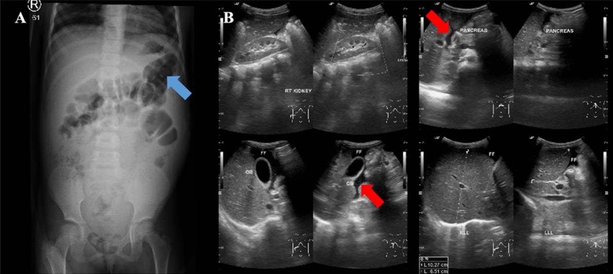 Her current clinical status was within normal limits; however, anthropometry indicated undernutrition, with mid-upper arm circumference (MUAC) at 76% of the standard reference value. The abdomen was distended (abdominal circumference: 62 cm), with positive bowel sounds, undulation, and shifting dullness. The laboratory findings indicated mild anemia, with a hemoglobin (HGB) level of 10.70 g/dL and a mean corpuscular volume (MCV) of 75.50 fL. Other laboratory tests, including liver function tests, were within normal limits.