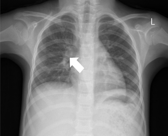Her vital signs were within normal limits, but the anthropometric assessment indicated undernourishment (MUAC 76%). The abdominal examination showed distention (60 cm) with distant bowel sounds. The ascites drainage inserted at the previous hospital was well-placed, aiding in the removal of excess fluid. The tuberculin skin test showed an 8 mm induration, and the chest radiograph from the previous hospital showed hilar right lymphadenopathy (Figure 4). The MTB/RIF Ultra from gastric lavage was negative.