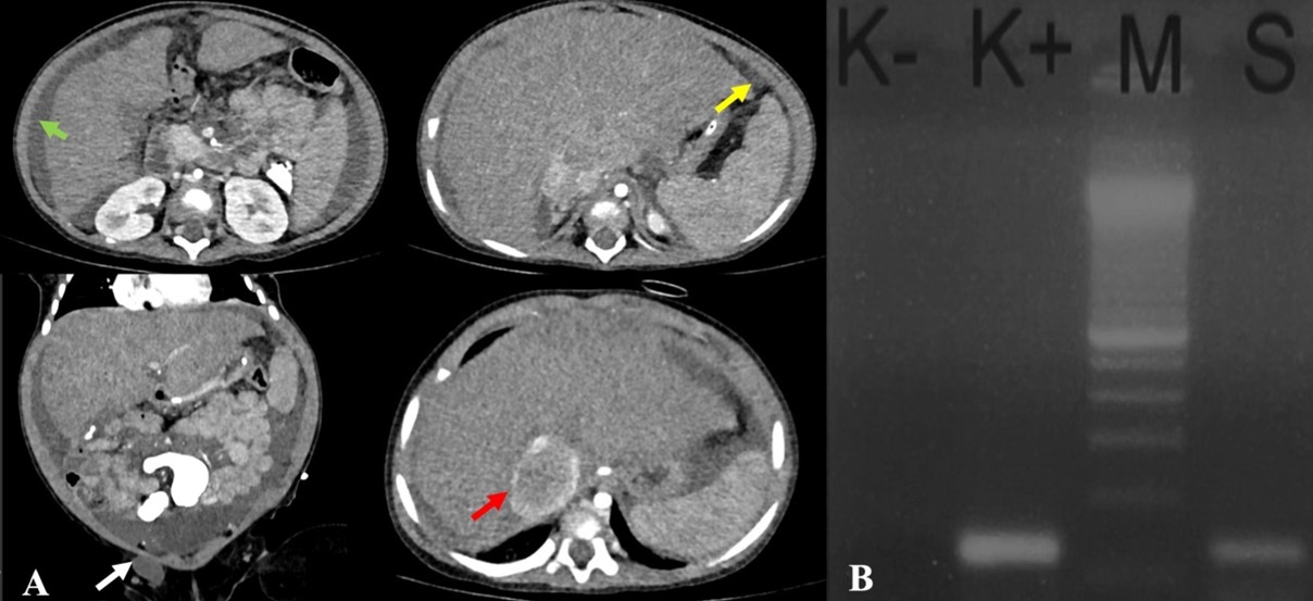 Ascitic fluid analysis revealed a serum-ascites albumin gradient (SAAG) of 1.5 g/dL (transudate). Subsequently, the MTB/RIF Ultra was negative, and the ADA was 20 U/L. Given the inconclusive findings, we opted for in-house polymerase chain reaction (PCR) testing of the ascitic fluid rather than laparoscopy due to the significant ascites. The primers and target gene used for the PCR were provided by our Clinical Microbiology Laboratory, as follows: PCR TB E1 (5′-CCTGCGAGCGTAGGCGTC) and PCR TB E2 (5′-CCGTCCAGCGCCGCTGTCGG), targeting the IS3-like element IS987 family transposase. DNA extraction was performed using the QIAamp DNA Mini Kit, and amplification was carried out with a T100 Thermal Cycler (Bio-Rad) using GoTaq Green Master Mix. The ascitic fluid sample tested positive for TB by PCR, thereby confirming the diagnosis of abdominal TB. The patient completed the intensive phase of ATT with two pediatric fixed-dose combination RHZE tablets once daily for 2 months and entered the continuation phase. (Figure 5B).